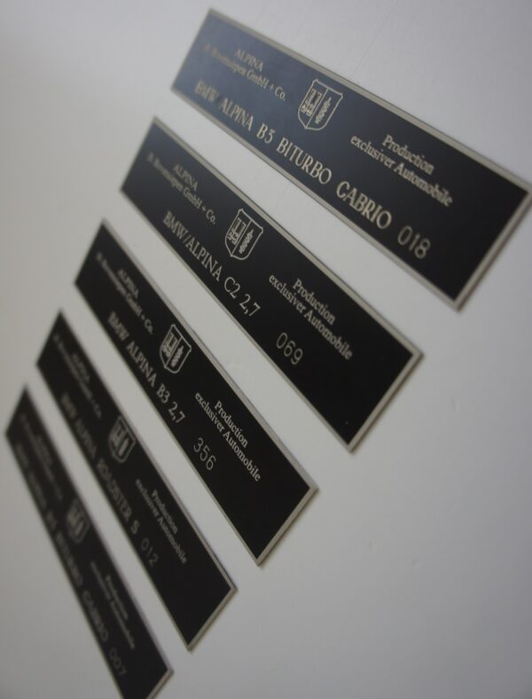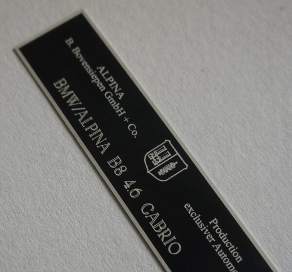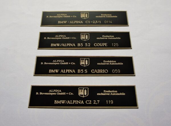 Fonts are custom designed by double lining. ALPINA logo is made in very high quality graphic, to get nearly perfect look, as close to genuine as possible. All is burned by the laser on 0.5mm brass. Please attach the picture of your old plaque or text with car details (model and number).