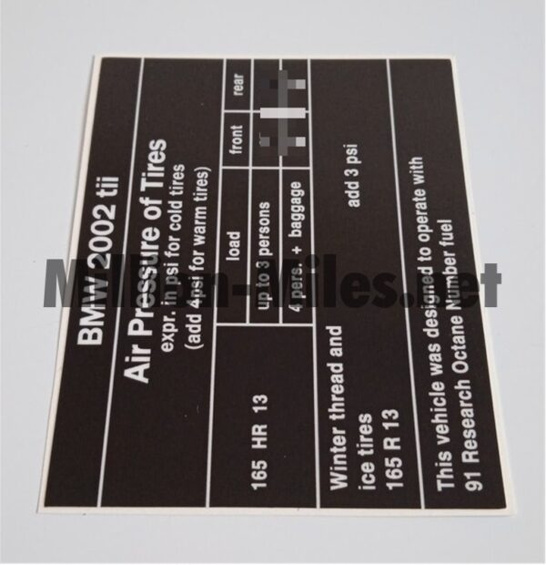 BMW E10 Tire Pressure 2002 tii Reviews There are no reviews yet. Be the first to review “BMW E10 Tire Pressure 2002 tii #0761”Cancel ReplyYour email address will not be published. Required fields are marked *Your rating * Rate… Perfect Good Average Not that bad Very poor Name *Email *Your review * I accept the Privacy Policy Save my name, email, and website in this browser for the next time I comment. Submit