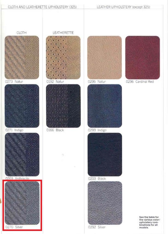 Reviews There are no reviews yet. Be the first to review “BMW E30/E34 Upholstery Silver code 0270”Cancel ReplyYour email address will not be published. Required fields are marked *Your rating * Rate… Perfect Good Average Not that bad Very poor Name *Email *Your review * I accept the Privacy Policy Save my name, email, and website in this browser for the next time I comment. Submit