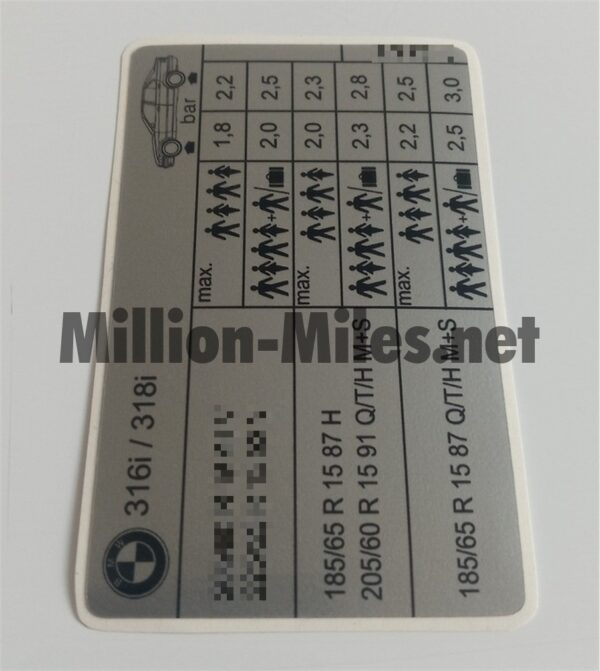 Tire pressure REPLICA 15” black font Reviews There are no reviews yet. Be the first to review “BMW E36 316i / 318i #0014”Cancel ReplyYour email address will not be published. Required fields are marked *Your rating * Rate… Perfect Good Average Not that bad Very poor Name *Email *Your review * I accept the Privacy Policy Save my name, email, and website in this browser for the next time I comment. Submit