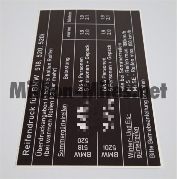 BMW Tire pressure E12 518 / 520 / 520i Reviews There are no reviews yet. Be the first to review “BMW Tire pressure E12 518 / 520 / 520i #0754”Cancel ReplyYour email address will not be published. Required fields are marked *Your rating * Rate… Perfect Good Average Not that bad Very poor Name *Email *Your review * I accept the Privacy Policy Save my name, email, and website in this browser for the next time I comment. Submit