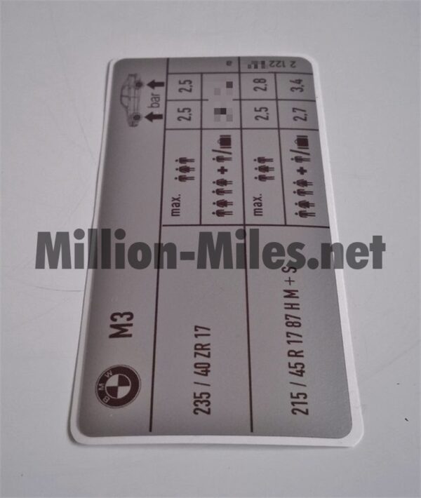 BMW Tire Pressure Pre-FL E36 M3. Brown font Reviews There are no reviews yet. Be the first to review “BMW Tire Pressure Pre-FL E36 M3 #0700”Cancel ReplyYour email address will not be published. Required fields are marked *Your rating * Rate… Perfect Good Average Not that bad Very poor Name *Email *Your review * I accept the Privacy Policy Save my name, email, and website in this browser for the next time I comment. Submit