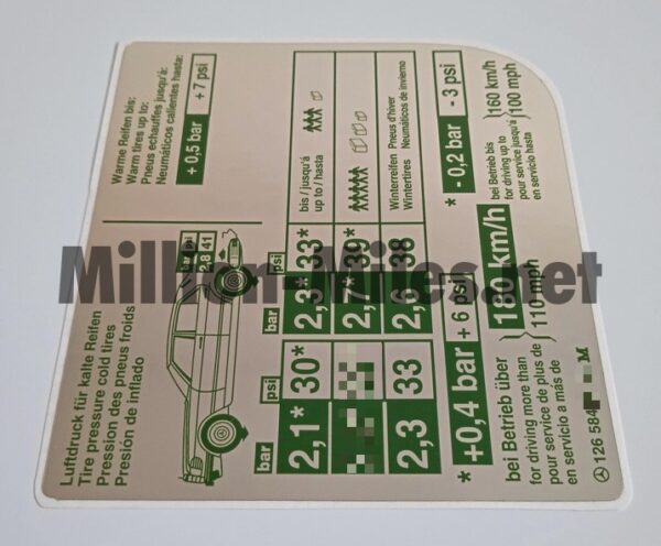 MB Tire pressure W126: (seen in various models) -420SEC -500SE Reviews There are no reviews yet. Be the first to review “MB Tire pressure W126 420SEC #0314”Cancel ReplyYour email address will not be published. Required fields are marked *Your rating * Rate… Perfect Good Average Not that bad Very poor Name *Email *Your review * I accept the Privacy Policy Save my name, email, and website in this browser for the next time I comment. Submit
